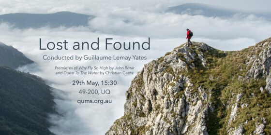 Lose yourself, for you will be found.    Let QUMS take you on a journey for our first major concert of the year, as we explore the deeply personal themes of loss, grief, yearning, discovery and salvation.  We're especially proud to be premiering two new works this concert! Why Fly So High is by John Rotar, a young Brisbane-based musician and composer and part of the extended QUMS family. Down To The Water is by Christian Gante, who is not just an incredibly talented pianist in his own right, but our accompanist too.  QUMS is conducted by Guillaume Lemay-Yates as Acting Musical Director.  There will also be a raffle, with lots of great prizes to win!   QUMS accepts Companion Cards for those accompanying paying patrons with disabilities.  UQ is easily accessible by public transport, and car parking is free on weekends. Please refer to UQ's parking information for more details.