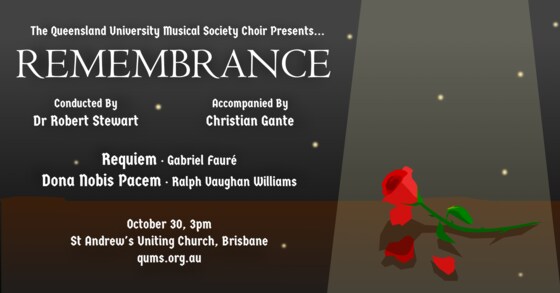 Lest we forget. QUMS' latest concert focuses on the themes of Remembrance Day. Join us as we sing through two hauntingly beautiful pieces by Gabriel Fauré and Ralph Vaughan Williams!  Ralph Vaughan Williams' Dona Nobis Pacem pleads for peace in vivid colour and insistent rhythm. Gabriel Fauré's Requiem lulls the soul to rest.  Both pieces feature up-and-coming soloists from UQ: soprano Jacalyn Adcock and baritone Jia-Peng Yeung.  Transport options are plentiful for St Andrew's Uniting Church. The church is across the road from Central Station and a short walk from the buses of King George Square, Adelaide St and the Queen St Mall. And for those who come by car, $5 weekend parking is available at Council's Wickham Tce and King George Square carparks.